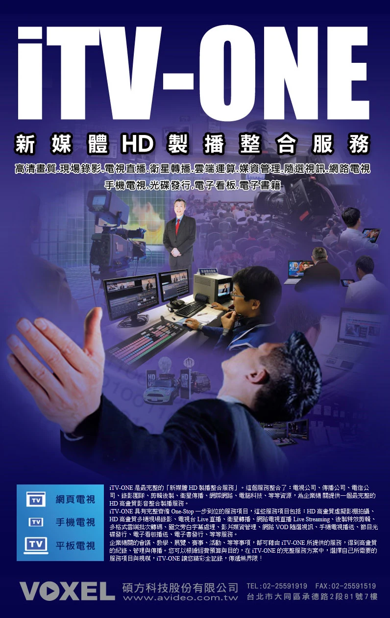iTV-ONE 是最完整的「新媒體 HD 製播整合服務」。這個服務整合了:電視公司、傳播公司、電信公司、錄影團隊、剪輯後製、衛星傳播、網際網路、電腦科技、等等資源,為企業機 關提供一個最完整的 HD 高畫質影音整合製播服務。